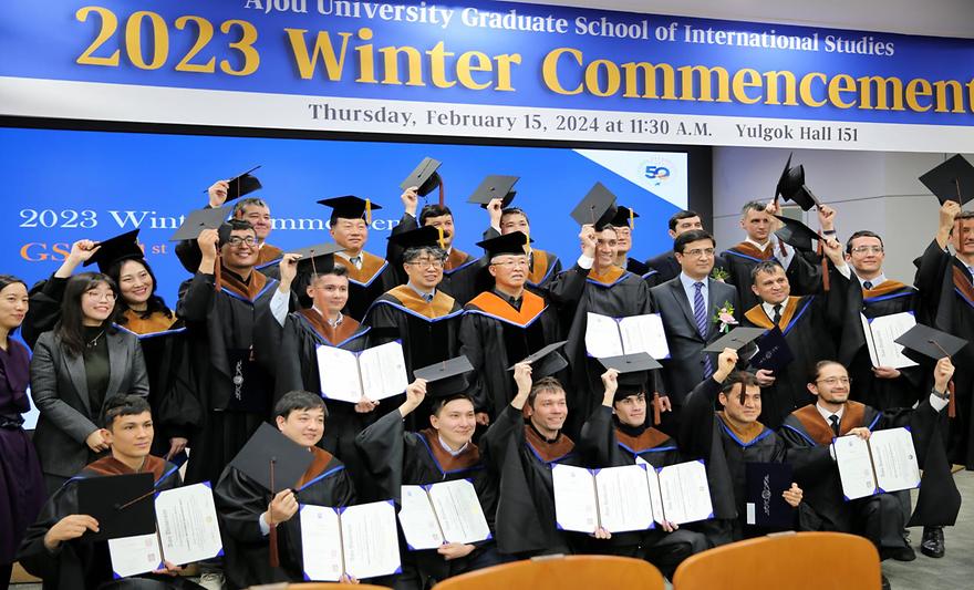 On February 15th, the graduation ceremony of the first batch of students to earn a dual degree from Ajou University and the Graduate School of Business and Entrepreneurship (GSBE) in Uzbekistan took place. Present at the ceremony were the Uzbek graduates and officials from the Embassy of Uzbekistan in Korea, and members of Ajou University, including President Choi Kee-choo and Dean Chang Byeong-Yun of the Graduate School of International Studies. The graduation ceremony opened with an address by President Choi Kee-choo, followed by addresses by Dean Chang Byeong-Yun and Ambassador of Uzbekistan to Korea Fakhriddin Nabiev, and the conferment of degrees and awards, and ended with a presentation by the student president. Ajou University entered into a partnership on operation of a dual degree program with the GSBE, an education institution operating under the Uzbek Ministry of Economy and Finance, in 2022. The Uzbek Ministry of Economy and Finance was the catalyst for the partnership when it requested collaboration in developing Uzbek IT business experts. Uzbek students who undertake the dual degree program are selected each year by the GSBE, where they complete Semester 1 and 2 of the program, followed by Semester 3 and 4 at the Graduate School of International Studies at Ajou University. The program runs for 18 months, during which the students study at the Graduate School of International Studies at Ajou University for majors in global business and IT business. Graduates of the program are awarded a dual degree from Ajou University and the GSBE. The first group of graduates was made up of Uzbek public and private sector employees, in fields such as IT, HR, and marketing. Twenty students completed the inaugural dual degree program. President Choi extended congratulations to the graduates, saying “The first graduation from the dual degree program of Ajou University and the GSBE is meaningful.”He urged the graduates to “trust themselves and dream big.”Dean Chang Byeong-Yun said, “The Graduate School of International Studies at Ajou University is where change begins,” adding that he hoped “you graduates will take your learning wherever you go to initiate and lead change.” Ajou University founded Ajou University in Tashkent (AUT) in Uzbekistan in February 2021, and provides the new school with curricula and expertise. At present, the Ajou University undergraduate programs available at AUT are in Electrical and Computer Engineering, Civil Systems Engineering, and Architecture. Graduates of these programs are awarded a degree from Ajou University. The undergraduate programs offered by AUT itself are in Korean Philology and Management, English Philology and Management, and IT-Business. The first graduates of AUT will be graduating in June this year. President Choi conferring a diploma on a graduate of the dual degree programThe student president delivering an address