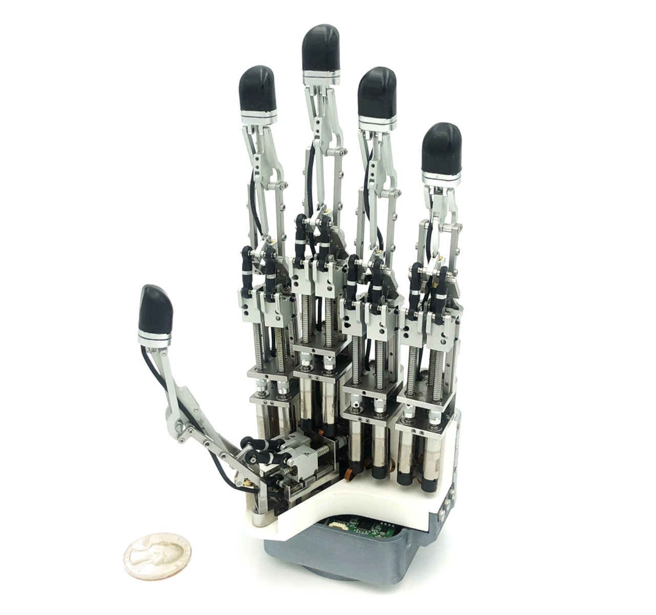 기계공학과 연구자가 강력한 악력을 가지면서 동시에 섬세한 도구 조작도 가능한 인간형 로봇 손을 개발하는 데 성공했다. 로봇 손 구동을 위한 모든 구성요소가 자체 내장된 데다 기존의 로봇 손들로는 불가능했던 여러 작업이 가능해 앞으로 다양한 분야에 활용될 전망이다.김의겸 교수(기계공학과)는 촉각 센서와 구동기를 비롯한 모든 구성요소를 포함한 일체형(All-in-one) 인간형 로봇 손 개발에 성공했다고 밝혔다. 이번에 개발한 로봇 손은 일상 생활에 필요한 대부분의 도구를 조작할 수 있을 뿐 아니라 인간 수준의 자유로운 움직임이 가능하다.이번 연구 성과는 저명 학술지 <네이처 커뮤니케이션즈(Nature Communications, Impact Factor 14.919)> 12월15일자에 온라인 게재됐다. 논문 제목은 ‘링크 구동 기반의 모든 구성요소가 통합된 인간형 로봇 손 (Integrated Linkage-Driven Dexterous Anthropomorphic Robotic Hand)’이다. 이번 연구에는 제1저자 및 교신저자로 김의겸 아주대 교수(기계공학과)가, 공동 제1저자로 정다운 고려대 박사과정 학생이 참여했으며, 한국기계연구원(KIMM) 로봇메카트로닉스실과의 협력 연구로 진행되었다.연구팀이 개발한 로봇 손은 강력한 악력을 가지면서 동시에 섬세한 도구 조작이 가능하다. 이번에 개발한 로봇 손이 들 수 있는 무게는 18kg에 달한다. NASA가 개발한 로봇(Robonaut II hand)의 가반하중이 9kg인 것을 고려해 볼 때, 아주대 연구팀이 개발한 로봇 손의 가반하중 18kg은 매우 높은 수준이다. 이에 기존의 로봇 손들로는 불가능했던 ▲맥주 캔 찌그러뜨리기 ▲무거운 아령 들기 등을 수행할 수 있다. 더불어 섬세한 움직임과 높은 자유도를 필요로 하는 다양한 도구의 사용도 가능하다. 연구팀은 이 로봇 손을 활용해 ▲가위로 종이 자르기 ▲핀셋으로 작은 칩 옮기기 등을 시현하는 데 성공했다. 인간형 로봇 손은 로봇 말단 장치 중 가장 작업의 영역이 넓고 활용성 역시 매우 높다. 현재 개발된 로봇 말단 장치들은 특정 환경에 특화되어 개발되었기 때문에 다양한 환경에서의 사용이 매우 제한적이다. 이에 국내·외 많은 연구자들이 인간형 로봇 손에 대해 활발한 연구를 해왔다. 그러나 사람 손 수준의 자연스러운 움직임과 강한 악력, 촉각에 기반한 섬세함까지를 모두 구현해 내기에는 여러 한계가 있었다. 특히 로봇 손은 우수한 성능을 얻기 위해 촉각 센서, 구동기, 제어기 등의 구성 요소를 필요로 하며, 이는 로봇 팔뚝 형태에 추가 모듈로 포함되어야 했다. 추가 모듈은 로봇 손과 상용 로봇 팔과의 결합을 어렵게 하는 요소가 된다.김의겸 교수팀은 이러한 문제를 해결하기 위해 촉각 센서와 구동기, 제어기 등의 모든 구성 요소를 로봇 손 자체에 내장시켜 완성해 냈다. 모든 구성 요소가 일체화(All-in-one)된 형태로 높은 자유도와 강한 악력, 정밀한 제어가 모두 가능한 고성능 로봇 손을 구현해 낸 것. 이에 기존 로봇 손에 비해 더욱 다양한 환경에서 폭넓은 활용이 가능하다. 이번 연구의 핵심 기술로는 링크 기반의 새로운 메커니즘 기술과 촉각 센서의 결합 기술을 들 수 있다. 연구팀은 링크 기반의 병렬 메커니즘과 직렬 메커니즘을 조합하여 새로운 메커니즘을 개발, 이를 통해 로봇 손 손가락의 독립적인 3자유도 움직임을 구현해 냈다. 3자유도 움직임이란손가락의 가장 안쪽 관절(중수지절간관절)에서의 두 방향 움직임(앞/뒤, 좌/우)과 중간 관절(근위지절간관절)의 한 방향 움직임(앞/뒤)을 의미한다. 김의겸 교수는 “손가락 크기의 좁은 공간에서 인간 손가락과 같은 3자유도의 독립적 움직임을 구현해 내는 것은 쉽지 않은 과제”라며 “링크 기반의 새로운 메커니즘 기술을 개발함으로써 이를 해결할 수 있었고 덕분에 기존 상용 로봇 팔과의 결합이 용이했다”고 설명했다.연구팀은 또한 로봇 손가락 끝에 민감도가 높은 6축 힘토크 센서를 내장, 손가락 끝에서 섬세하게 힘의 크기와 방향, 위치를 모두 측정할 수 있게 했다. 이 촉각 센서를 로봇 손에 내장하기 위해 연구팀은 결합 형태, 배선, 통신, 측정 보드를 고려하였고 컴팩트하게 결합할 수 있었다.김의겸 교수는 “이번에 개발한 고성능 로봇 손은 로봇 그리퍼나 의수를 비롯해 여러 분야에서 쓰일 수 있다”라며 “로봇 제어 연구, 딥러닝이나 강화학습 연구 등에도 적용 가능해 산업계와 우리 사회의 여러 영역에서 널리 활용되기를 기대한다”고 전했다. 이번 연구는 아주대학교 정착연구비 지원과 한국기계연구원 창의도전형 과제 지원으로 수행되었다. 이번에 개발된 로봇 손의 가반하중(물체를 들 수 있는 힘)은 18kg이다. 손가락 끝단에서 낼 수 있는 힘은 34N이고, 높은 자유도(15DOF), 20개의 관절 수, 1.1kg의 가벼운 무게, 최대 길이 218mm의 하드웨어 성능을 지닌다.