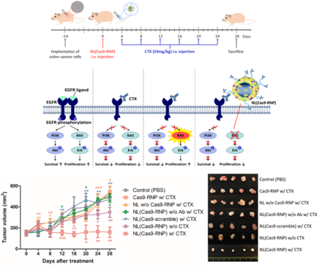 우리 학교 윤태종 교수 연구팀이 나노-유전자 가위 기술을 활용해 대장암 치료제를 개발하는 데 성공했다. 현재 널리 쓰이고 있는 대장암 항암제에 치료 효과를 보이지 않는 유전자 변이 대장암 환자들을 위한 치료법이다.윤태종 교수(약학과)는 조영석 가톨릭대 교수(의과대학 내과학교실)와 함께 나노 전달체에 유전자 가위 단백질 구조체를 탑재하는 방식을 통해 유전적 이상 부위를 효과적으로 편집함으로써 새로운 대장암 치료제를 개발하는 데 성공했다고 밝혔다. 관련 내용은 저명 학술지 <나노 리서치(Nano Research)> 4월4일자 온라인판에 게재됐다. 논문의 제목은 ‘항암제 내성 대장암을 치료하기 위한 유전자 편집 나노 입자 시스템의 치료적 접근(Gene editing particle system as a therapeutic approach for drug-resistant colorectal cancer)’이다.윤 교수팀이 개발한 방법은 현재 대장암 치료를 위해 널리 사용되고 있는 약물에 저항성을 가져 치료가 어려웠던 환자들을 위한 것이다. 세툭시맙(cetuximab) 항암제는 대장암 치료를 위해 많이 쓰이고 있지만 암세포의 성장과 관련된 KRAS 유전자의 변이로 인해 치료 효과를 보지 못하는 환자가 많다는 점이 한계로 지적되어 왔다.대장암은 현대인의 식습관과 생활방식 탓에 지속적으로 발생이 증가하는 질병이다. 때문에 치료제 개발이 매우 활발히 진행되고 있으며, 주로 항체를 기반으로 한 약물이 사용되고 있다. 이 때쓰이는 약물은 EGFR 수용체에 결합, 암세포의 성장과 생존을 억제함으로써 치료 효과를 보인다. 그러나 대장암 환자 중 60% 정도는 약물에 저항을 나타내 더 이상 치료효과를 보이지 않는 것으로 알려져 있다. 이러한 경우는 암세포 성장과 관련된 KRAS 유전자의 변이에 의한 것으로, 관련된 환자들의 경우 예후가 매우 좋지 않다.많은 연구자들이 KRAS 유전자 변이에 의한 암을 치료하기 위해서 노력하고 있으나, 유전자 변이로 인해 지속적으로 암이 재발하면서 근본적 치유 방법에 대한 연구가 요구되어 왔다. 때문에 유전자 가위 기술유전자 가위 기술을 활용하는 것이 대안으로 제시되어 왔으나, 단백질 형태의 유전자 가위 소재가 체내에서 안정성이 크게 저하되어 효율성 문제의 해결이 쉽지 않았다.이에 윤태종 교수 연구팀은 나노 전달체에 유전자 가위 단백질 구조체를 탑재하여 유전적 이상 부위를 효과적으로 편집함으로써, 높은 치료 효과를 거둘 수 있음을 밝혀냈다. 연구팀은 나노 리포좀 구조체나노를 사용하여 KRAS 유전자 변이 부위를 편집할 수 있는 유전자 가위 단백질 소재를 탑재했다. 또한 이 나노 구조체 표면에 대장암 표적을 위한 항체를 도입함으로써, 유전자 가위 소재의 안정성과 치료 효과를 극대화할 수 있음을 확인했다. 생체 내 실험(in vivo)에서 암조직으로의 유전자 가위 소재 전달 효율은 60%에 달했으며, 동물 모델에서의 치료 효과는 대조군 대비 높은 치료 효과를 보였다.윤태종 교수는 “기존 유전자 형태의 유전자 가위 소재는 바이러스 전달체를 이용, 생체에 적용하는 구조로 전달 효율이 낮고, 원치 않는 부위까지 편집하게 되는 부작용(off-target 효과)이 문제였다”며 “이에 대안으로 단백질 구조체로 이뤄진 유전가 가위 소재가 부상했지만, 생체 내 주입 이후 효소들에 의해 분해되면서 전달·편집 효율이 낮아 한계를 보여 왔다”고 설명했다.이에 윤 교수 연구팀은 생체 적용이 가능한 소재로 이뤄진 나노 구조체를 발굴해 적용했다. 유전자 가위 기술을 이용해 유전자적 문제 부위를 편집하면 근본적 치료 가능성이 높아지나, 체내 주입 시 안정성이 떨어졌던 문제를 극복해낸 것.윤 교수는 “지금 현재는 암 치료를 위해 시험관 환경(in vitro)에서 면역 세포의 활성을 조절하는 수준의 유전자 가위 기술이 사용되고 있다”며 “앞으로는 직접 체내 주사를 통해 치료 효과를 극대화할 수 있을 것으로 기대한다”고 전했다. KRAS 유전자 변이에 의한 암은 대장암뿐 아니라 췌장암, 폐암, 난소암 등 많은 암 질환과 관련되어 있어, 치료가 어려운 암 질환의 극복을 위해서는 나노-유전자 가위 기술에 대한 연구가 더욱 긴요하다.윤태종 교수는 지난 20여 년간 다양한 바이오 물질을 효과적으로 세포나 조직에 전달할 수 있는 나노 소재를 연구해온 전문가다. 최근에는 유전자 가위 기술의 한계로 지적되어 온 ▲낮은 체내 안정성과 세포 침투율 ▲국부 치료가 불가능하다는 문제점 등을 극복하고자 나노 기술을 접목하는 연구에 집중해 왔다. 윤 교수는 우리 학교 산학협력단 산하의 엔포유 기술지주회사 ㈜무진메디의 대표를 맡고 있고 이 회사를 통해서 임상 시험을 진행할 계획이다.