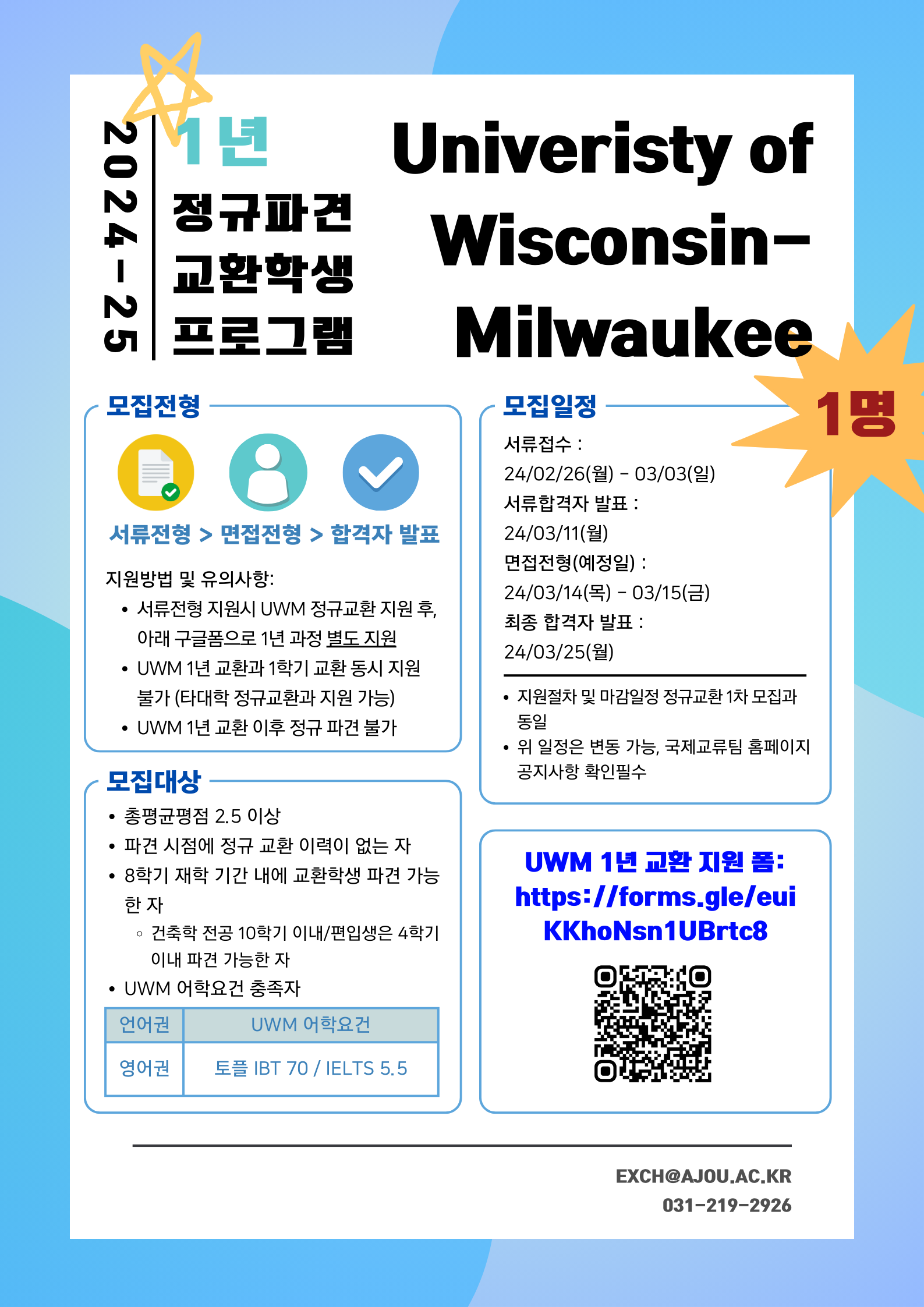 2024-2학기 정규교환 1년 프로그램 (UWM, Endicott College), 정규교환 1학기 IIT 모집 (~03.03)